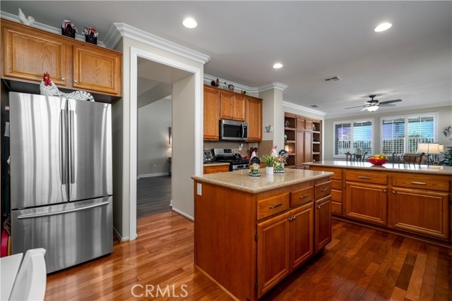 Welcome to 39523 Sierra Madre Dr, a Turnkey, Move In Ready home with a View located in Four Seasons Murrieta 55+ Active Retirement Community. Located just across the street from The Lodge, this home is the Traditional 3 Floor Plan, with 3 bedrooms, 2 bathrooms, and 2,289 sqft of living space. Lots of upgrades noticeable in the home completed in 2023. Luxury Vinyl Plank (LVP) flooring in the Living Room, Dining Room, Bedrooms, and Bathrooms and Wood flooring in the Kitchen and Family Room. The whole house was painted in 2023 with new hinges and door knobs added and hardware added to the cabinets. The kitchen has granite counters, pull out drawers, new stove, new microwave, new dishwasher, new stainless steel sink and fixtures. The Laundry Room utility sink was also replaced and has new fixtures. Plantation shutters throughout and Crown Molding and Upgraded Baseboards through most of the home. Ceiling fans added to the living room, family room, primary bedroom, and guest bedroom. The Primary Bathroom has new toilet, sink fixtures, mirrors, and light fixtures. The 2nd bathroom has new vanity, mirror, toilet, sink fixtures, and light fixtures. The 3rd bedroom is currently set up as an office, but does have added closet. The windows throughout the home are tinted and have sun blocking screens with automated sun shade for the living room window. There is also storage cabinets in the garage, soft water system, and recirculating pump on the water heater. The back yard is low maintenance with Vinyl Fencing and Alumnawood patio cover and is elevated with great sunset views! This home is a must see if you are wanting a Turnkey, Move In Ready home in the Four Seasons Community. Residents of Four Seasons Murrieta enjoy a vibrant community with a variety of clubs and activities, from art classes to yoga, bridge, billiards, and more. Outdoor amenities include a large pool, spa, BBQ area, putting green, golf practice area, horseshoes, shuffleboard, bocce ball, basketball, and lighted courts for tennis, pickleball, and badminton. Indoors, you can take advantage of the gym, library, billiards and card room, craft room, and a large ballroom for events. Nearby, you'll find a major shopping mall with excellent restaurants and movie theaters. Old Town Temecula, with its charming downtown and award-winning wineries, is just a few miles away. Come and discover the active, enjoyable lifestyle waiting for you at Four Seasons Murrieta!
