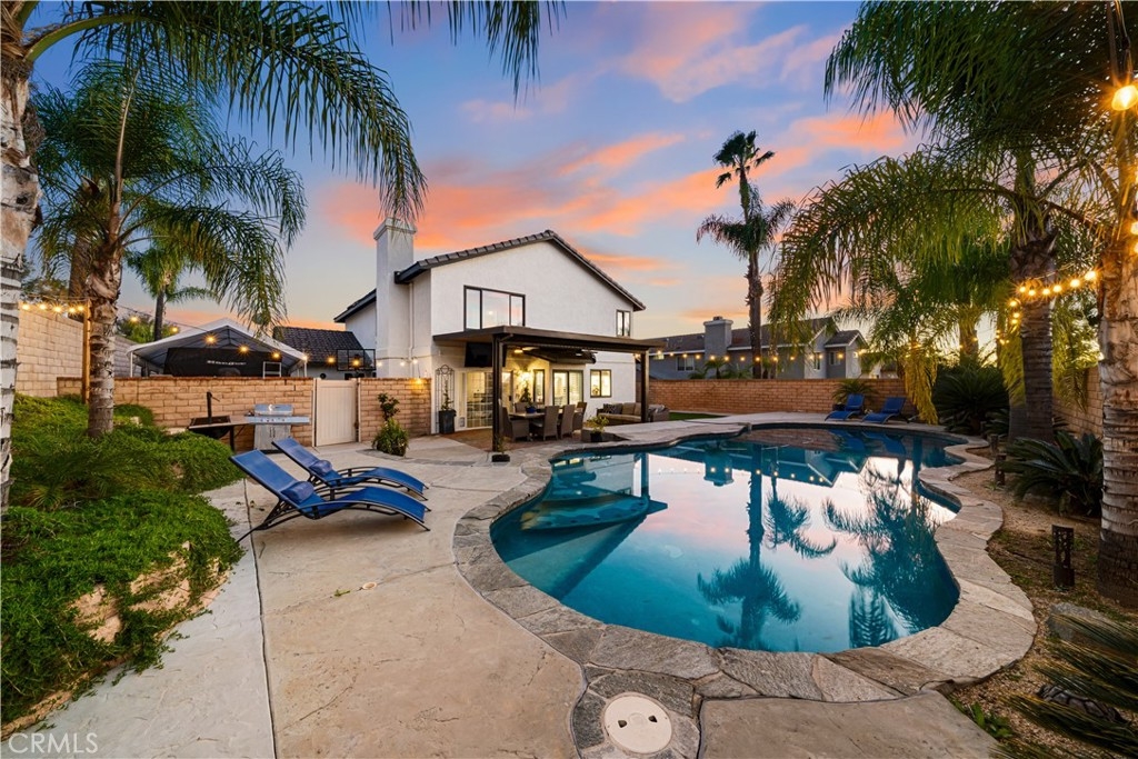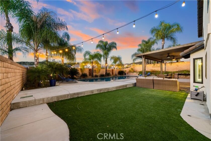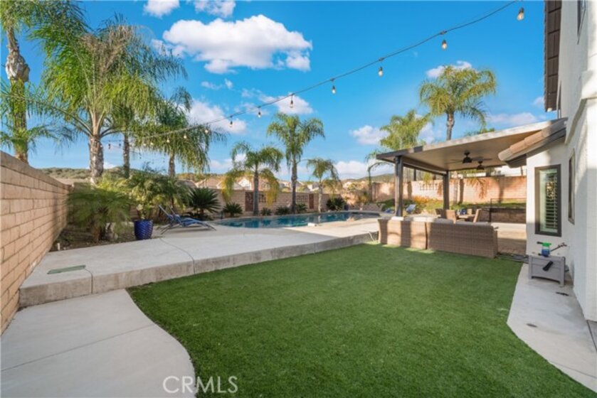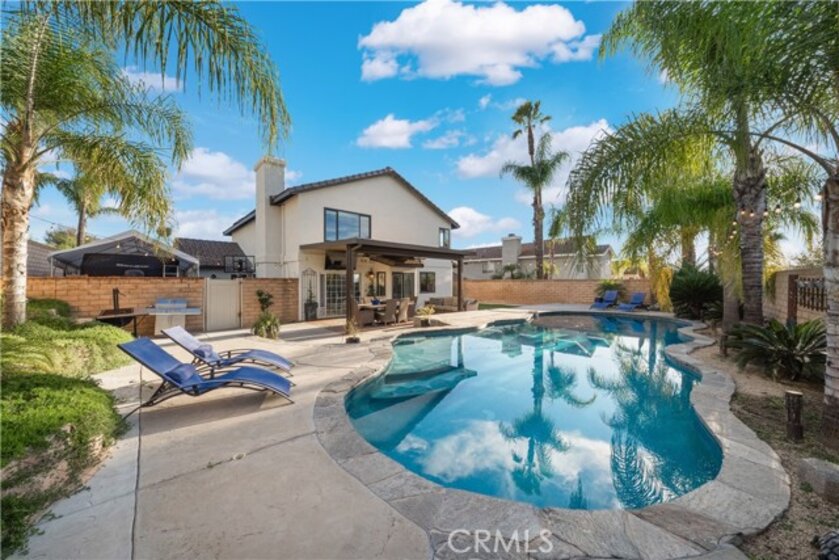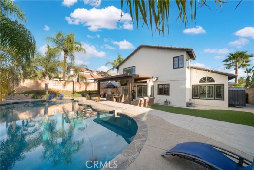 Welcome to this beautifully upgraded Murrieta residence on Copper Craft, offering a rare combination of space, functionality, and resort-style living. This 4-bedroom, 2.5-bath home is thoughtfully designed for everyday comfort, entertaining, and multigenerational needs, with no HOA and low taxes. Enter through double doors into a bright and open interior featuring vaulted ceilings and neutral designer tones throughout. Formal living and dining areas provide elegant gathering spaces, while the upgraded kitchen serves as the heart of the home with newer cabinetry, quartz countertops, stainless steel appliances, wine refrigerator, recessed lighting, coffered ceiling, in-kitchen eating area, and a movable quartz island. The kitchen opens seamlessly to the family room with a gas fireplace and picturesque views of the backyard oasis. The main level includes a convenient powder room and a private laundry room tucked behind a custom barn door. All bedrooms are located upstairs, providing separation and privacy ideal for multigenerational living. The spacious primary suite is entered through French doors and features high ceilings, a large picture window, and a spa-inspired ensuite bath with soaking tub, walk-in shower, dual quartz vanity, and walk-in closet. Three additional generously sized bedrooms and a full bath complete the upper level. Step outside to your private resort-style backyard featuring a sparkling in-ground pool, patio ideal for entertaining, artificial turf, mature palm trees, block wall fencing, and scenic hill views. RV and recreation enthusiasts will appreciate the gated RV parking with 30-amp hookup and expansive side yard suitable for RVs, trailers, or additional storage. The three-car garage includes finished flooring and electric vehicle hookup. Additional features include paid-off solar that is heating the pool, tankless water heater, newer dual-pane windows and whole house fan. Conveniently located near top-rated Murrieta schools, walking trails, shopping, hospitals, Costco, and easy access to the 15 and 215 freeways. Close to the Santa Rosa Plateau, Downtown Murrieta, Old Town Temecula, and Temecula Wine Country. This home offers the space, amenities, and lifestyle today’s buyers are seeking.