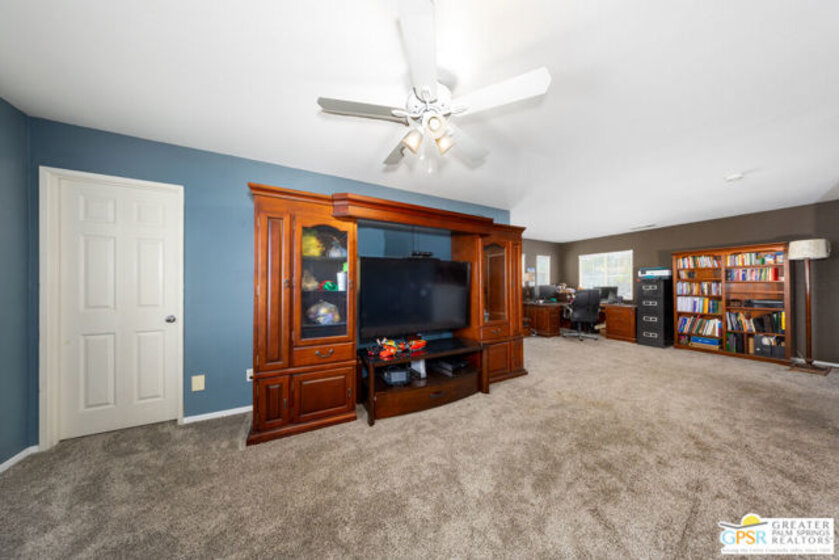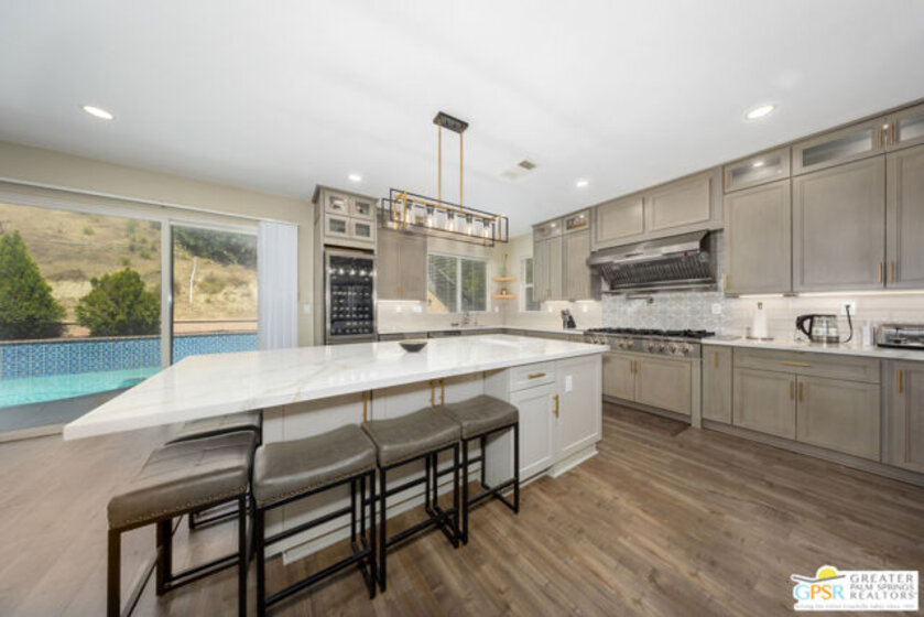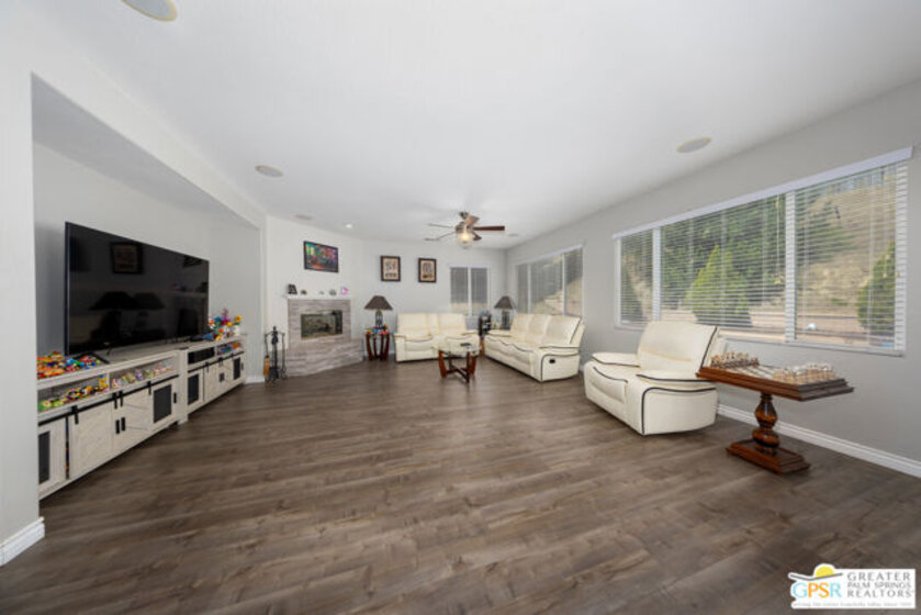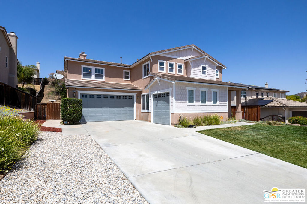 Prepare to be impressed by this beautiful two-story home featuring a chef's gourmet kitchen with stainless steel appliances, a 48-inch cooktop with 20,000 BTU burners, 48-inch hood with warming lights, double wall ovens, and a built-in steam oven. The oversized island seats up to nine and showcases white quartz countertops with gold inlay, custom cabinetry, recessed lighting, and lit upper cabinets. Additional highlights include a wine cooler with ice maker and dual dishwashers perfect for entertaining. The kitchen opens to a spacious family room with laminate flooring, fireplace, and surround sound, which also extends to the Master bedroom. The home includes an upgraded downstairs bathroom, a large upstairs loft, central vacuum system, and security system. Upstairs, you'll find a generous loft offering versatile space ideal for a media room, home office, or additional lounge area. The upper level also features a spacious Master suite with an en-suite bathroom, two additional bedrooms, a full bath, and a convenient laundry room. Enjoy the backyard with a pool and spa, plus a fire pit for relaxing or entertaining. Complete with a three-car garage.