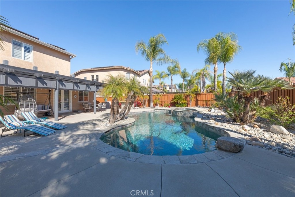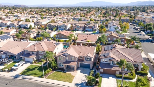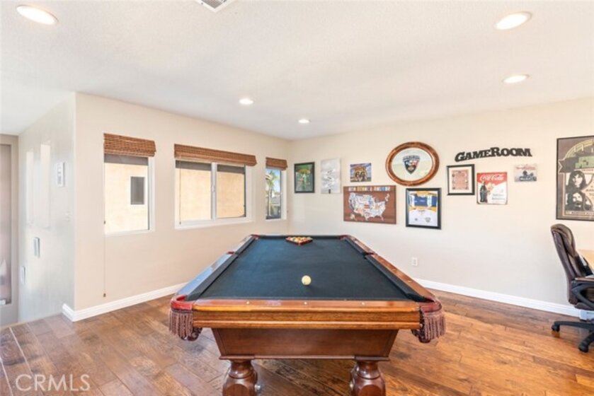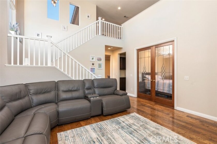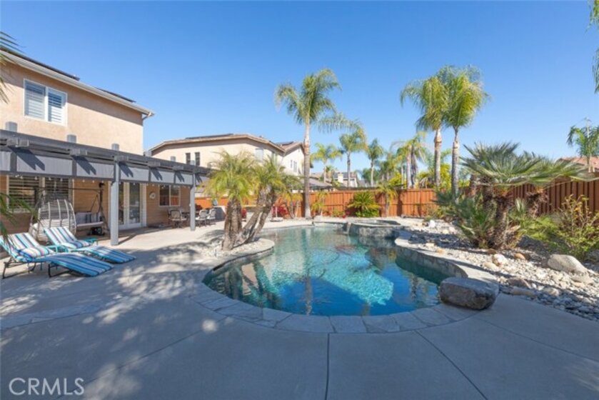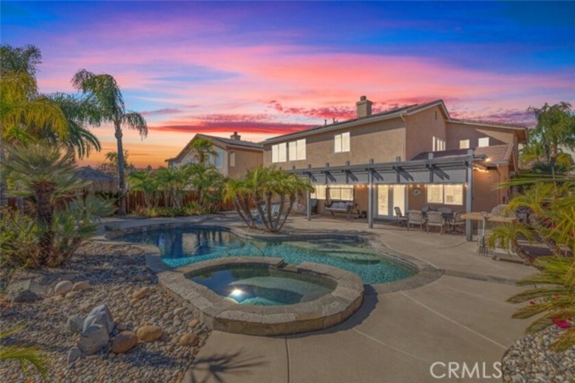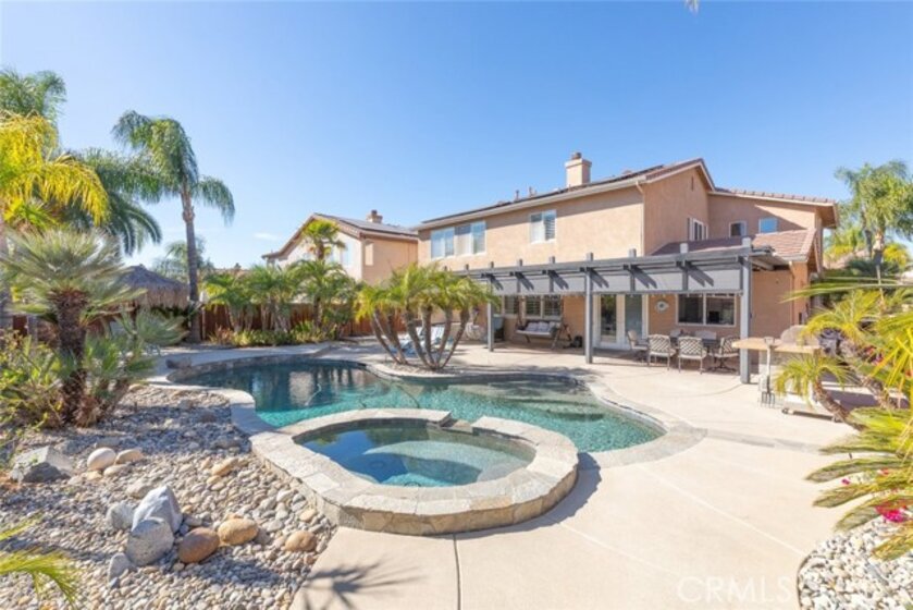 Discover your own slice of paradise with this stunning pool home with PAID OFF SOLAR! Once you step inside this beautiful home, and you'll be welcomed by soaring ceilings and gorgeous hardwood floors that flow throughout the main level. Right off the entry is an optional bedroom, complete with plenty of with custom leaded glass doors. Heading towards the heart of the home, and you'll find an open floor plan perfect for cooking, mingling, and making memories! The kitchen shines with updated cabinets, granite counter tops, and stainless-steel appliances—ideal for the home chef. Nearby, the living room is a showstopper with its shiplap accent wall, updated fireplace, and built-in TV area, adding both elegance and extra storage. Upstairs, an over sized loft/bonus area awaits, perfect for a pool table, movie marathons, or a fun hang-out spot for the kids. The second floor also houses two bedrooms, a guest bath, and a conveniently located laundry room. The primary suite offers a serene escape with plenty of space, plantation shutters, and an en-suite updated with wood cabinetry and custom tile work. Outside, get ready to be wowed by your own private oasis! An intimate courtyard sets the mood in the side yard that leads to a backyard that is built for fun, with a sparkling salt water pool, Jacuzzi, outdoor speakers, a built-in BBQ, and a covered patio built for entertaining with fan, TV and custom shades. This stunning Murrieta gem with NO HOA and PAID OFF SOLAR won’t last long. Come see it before it’s gone!