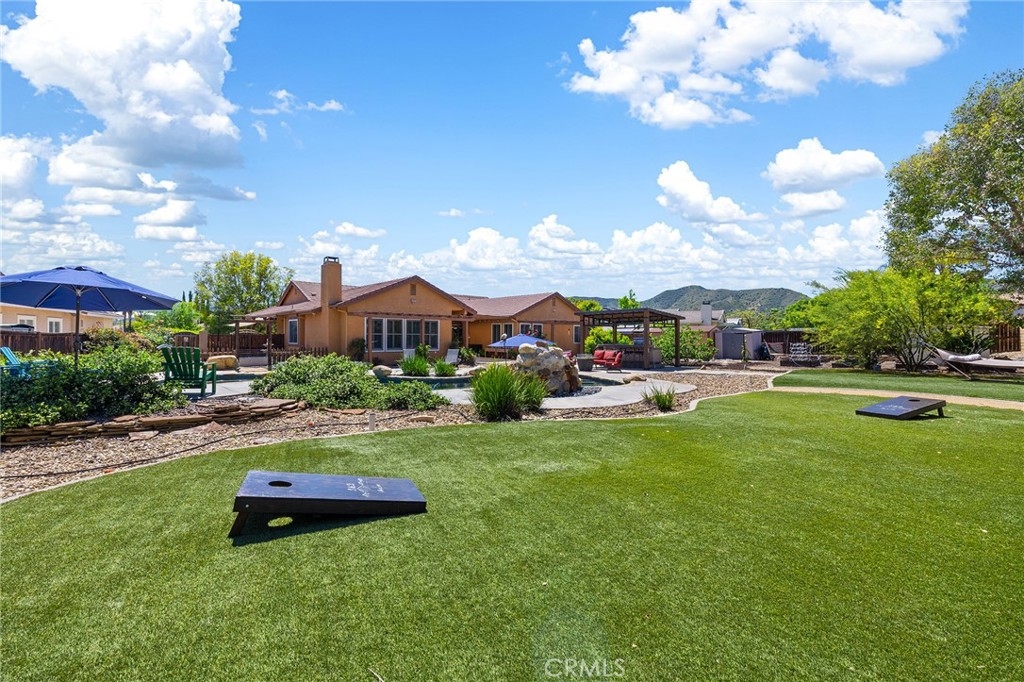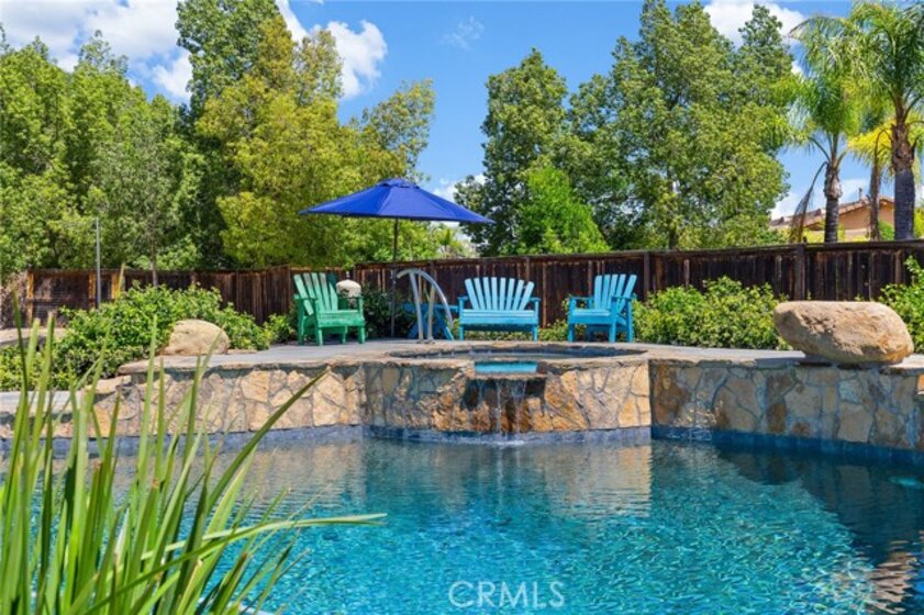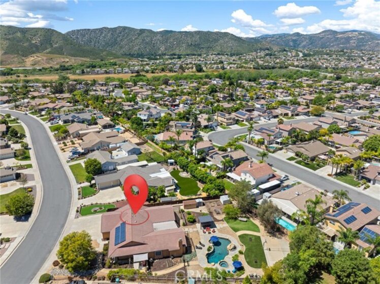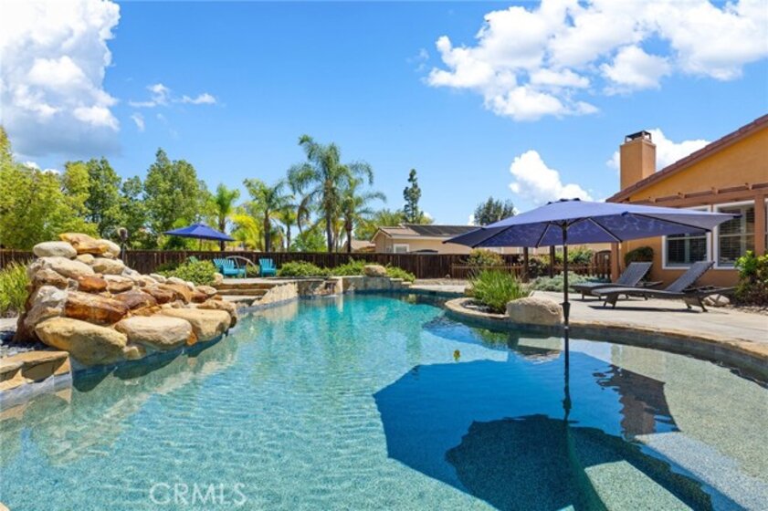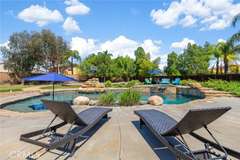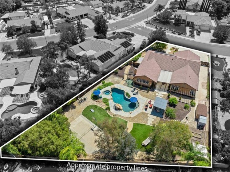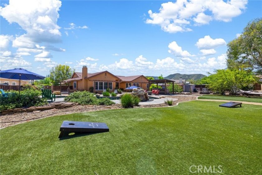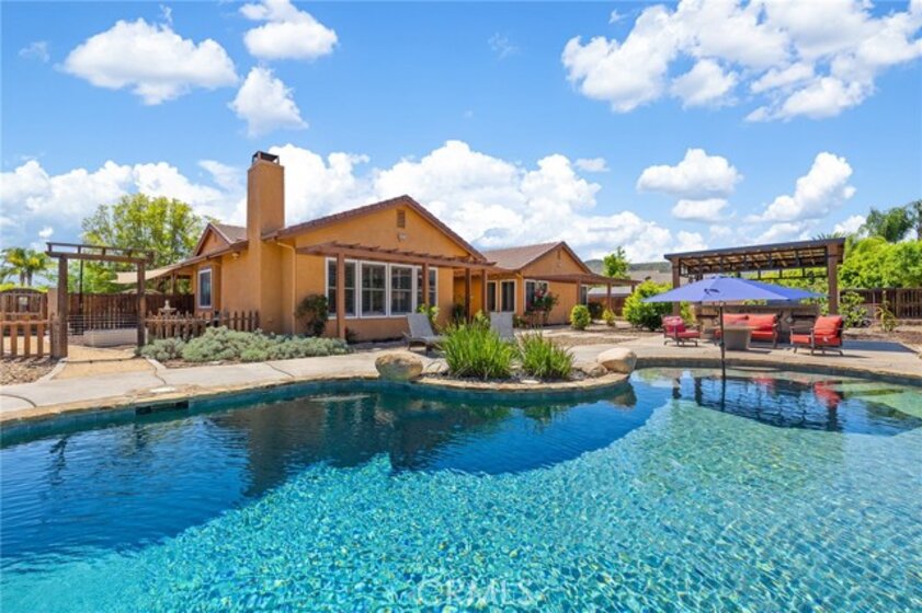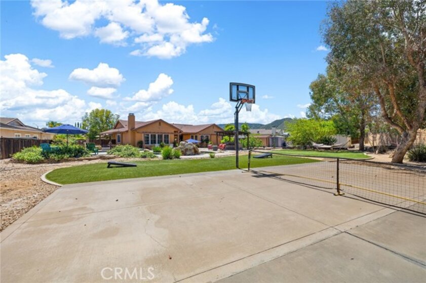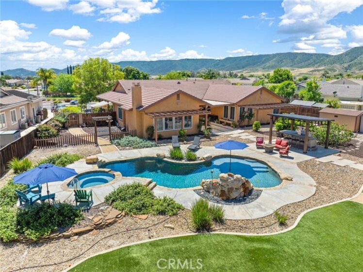 HALF-ACRE LOT, POOL & SPA, RV PARKING, SINGLE-STORY, SOLAR! Beautiful home in desirable West Murrieta neighborhood Murrieta Ranchos, situated on a .56 acre lot, open floorplan 3,084 square foot 4-bedroom plus theater room/ guest room, and 2.5 bathrooms. Formal Living & Dining rooms, huge kitchen open to the Family room, gas fireplace with raised hearth, spacious Primary Suite with ensuite bathroom; dual sinks, separate tub & shower, walk-in closet, and a doorway to the backyard. Hall bathroom has dual sinks & a separate shower area. Theater room also serves as a guest room, with a Murphy bed/ desk. Indoor laundry room with utility sink & plenty of cabinets. Wood-look tile flooring, plantation shutters, new carpet, new interior paint. Amazing yard with pebble-tech pool & spa, sport court, covered BBQ area with fridge, 2 gardens with raised garden beds, a large grassy area, gated RV parking, and 2 patio areas. House is equipped with 17 solar panels to lower energy costs. No HOA, and low taxes! This is a one-of-a-kind property!